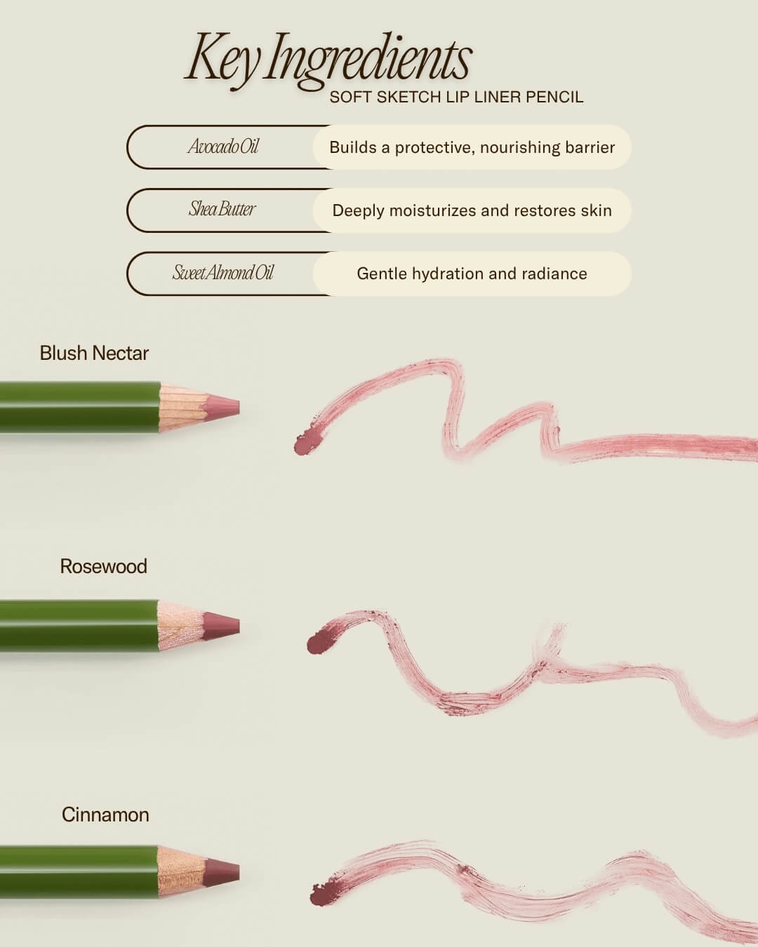 Define and shine in one effortless duo. The Soft Sketch Lip Liner Pencil delivers a creamy, precise outline that enhances your natural shape, while the Delicious Balm adds a hydrating wash of buildable color. Together, they create a polished, everyday lip look that feels as good as it looks.